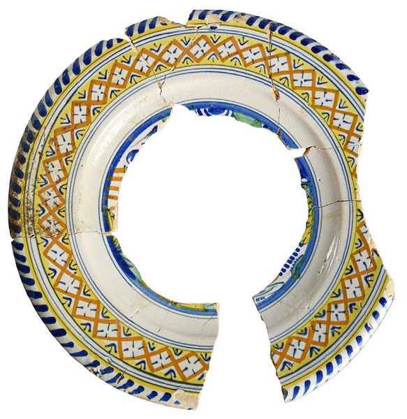 | 5c decoratie | beschilderd in blauw, oranje, groen en geel; spiegel: florale motieven?; vlag: geometrische motieven en kabelrand inwendig: polychroom |