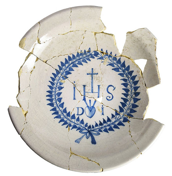 | 5c decoratie | beschilderd in blauw; spiegel: IHS-monogram, "D I" en hart doorboord met drie nagels binnen lauwerkrans inwendig: blauw |