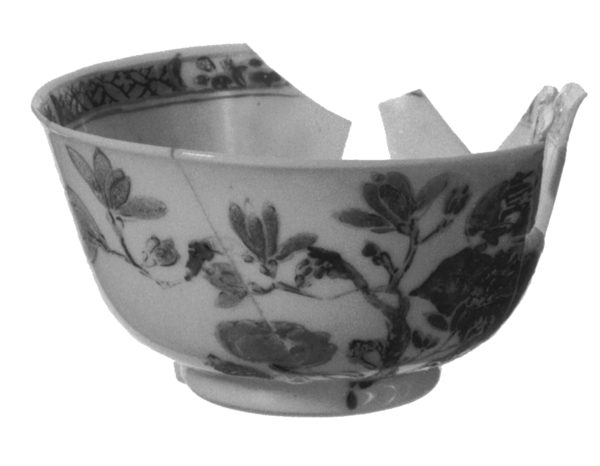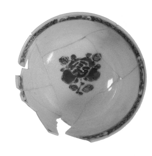 | 5c | inwendig: onderglazuur blauw, bovenglazuur goud en rood: spiegel: bloemen; rand: motief; uitwendig: onderglazuur blauw, bovenglazuur goud en rood: rozenstruik famille rose; Qianlong-periode blauw, rood en goud |