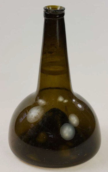 | 4b | bolvormige wijnfles met lange conische hals en uitgezakte buik met grootste breedte aan de basis, conisch opgestoken bodem met pontilmerk |