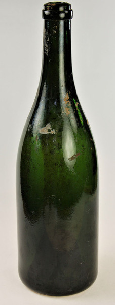 | 4b | dikwandige cilindrische champagnefles waarvan de schouder vloeiend overgaat in een lange hals, afgewerkte lip met platte draad, hoog opgebolde bodem, 1900-1950 draaismeer (1875-1925) |