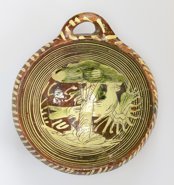 | 5c | ringeloorversiering en in slibkrastechniek met groene accenten: vogel met gespreide vleugels achter boom; jaartal 1605 |