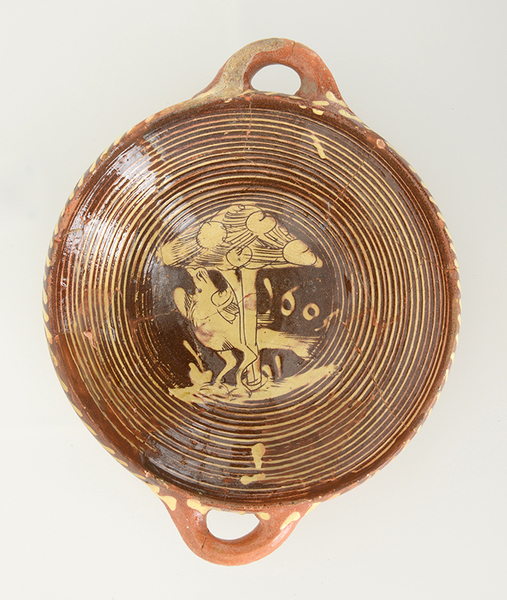 | 5c | ringeloorversiering en in slibkrastechniek: vogel met gespreide vleugels achter boom; jaartal 1605 |