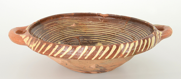 | 5c decoratie | ringeloorversiering en in slibkrastechniek: vogel met gespreide vleugels achter boom; jaartal 1605 |