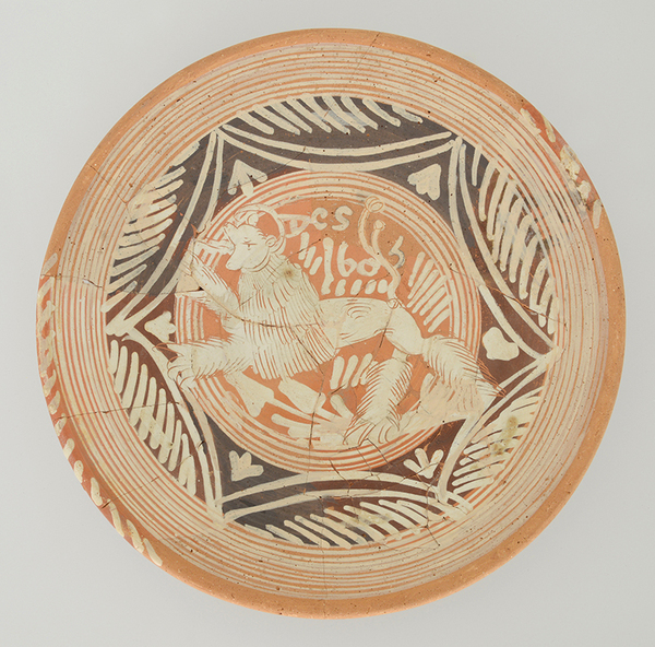| 5c decoratie | ringeloorversiering en in slibkrastechniek: leeuw met aureool, DCS, jaartal 1606. Decorateur II |