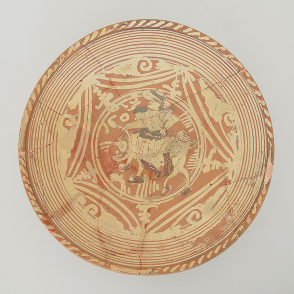 | 5c decoratie | ringeloorversiering en in slibkrastechniek: ruiter te paard; DCS en jaatal 1605 |
