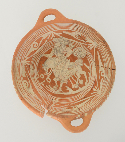 | 5c decoratie | ringeloorversiering; in slibkrastechniek: officier te paard met attribuut: luit? |