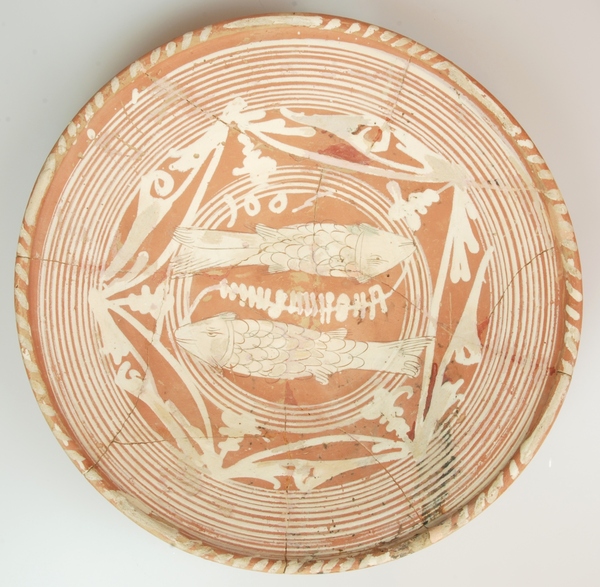 | 5c decoratie | ringeloorversiering; in slibkrastechniek: twee vissen, jaartal 1605 |