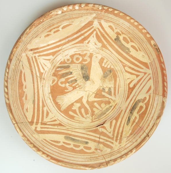 | 5c decoratie | ringeloorversiering, in slibkrastechniek: vogel met gespreide vleugels, DCS en jaartal 1603 |