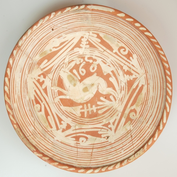 | 5c decoratie | ringeloorversiering, in slibkrastechniek: haas, DCS en jaartal 1605 |