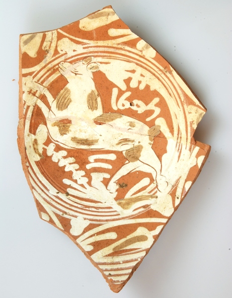 | 5c decoratie | ringeloorversiering, in slibkrastechniek: hinde, jaartal 1605 |