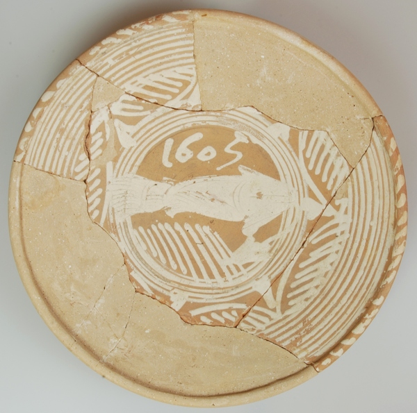| 5c decoratie | ringeloorversiering, in slibkrastechniek: vis, jaartal 1605 |