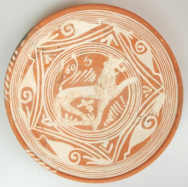 | 5c decoratie | ringeloorversiering, in slibkrastechniek: leeuw, jaartal 1605 |