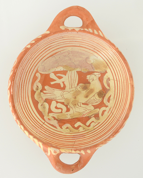 | 5c | ringeloorversiering, in slibkrastechniek: vogel met gesloten vleugels en boom |