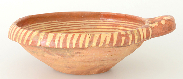 | 5c decoratie | ringeloorversiering, in slibkrastechniek: twee eikels met distel, jaartal 1605 |