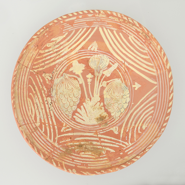 | 5c | ringeloorversiering, in slibkrastechniek: twee druiventrossen met distel en drie andere symbolen |