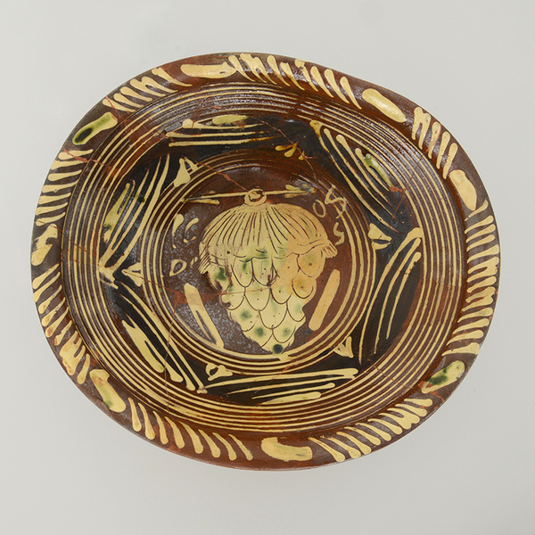 | 5c decoratie | ringeloorversiering, in slibkrastechniek: druiventros, DCS en jaartal 1605 |