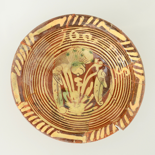 | 5c decoratie | ringeloorversiering, in slibkrastechniek: twee peulen en een distel, DCS en jaartal 1605 |