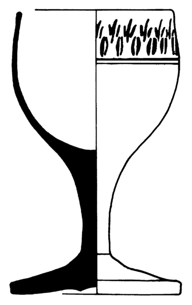| 4b | toegebogen trechter- of eivormig kelkglas met dikwandige bodem overgaand in rechte massieve stam, ook met luchtbel of spiraalvormige draadversiering, schijfvormige voet met pontilmerk |