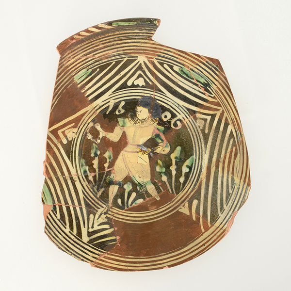 | 5c decoratie | ringeloorversiering, in slibkrastechniek: jongeman met krans, jaartal 1606 |