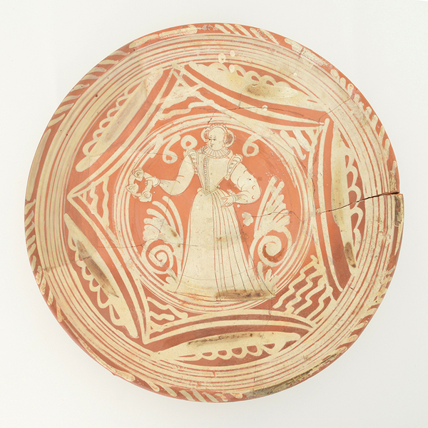 | 5c decoratie | ringeloorversiering, in slibkrastechniek: vrouw met krans, decorateur III; jaartal 1606 |