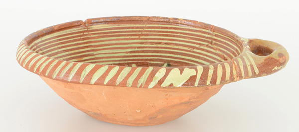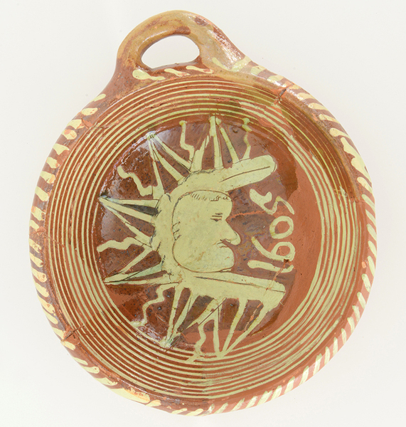 | 5c decoratie | ringeloorversiering, in slibkrastechniek: maan, jaartal 1605 |