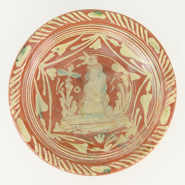| 5c decoratie | ringeloorversiering, in slibkrastechniek: berenjong, jaartal 1605 |