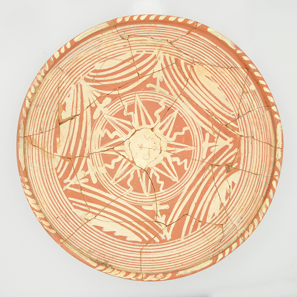 | 5c decoratie | slibversiering, in slibkrastechniek: 7-puntige zon |