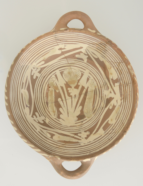 | 5c decoratie | slibversiering, in slibkrastechniek: twee peulen en een distel |