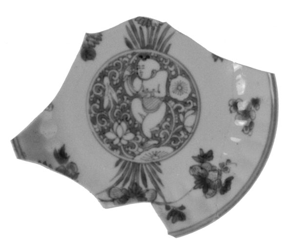 | 5c | inwendig: onderglazuur blauw: jongetje tussen lotusranken; vlak: onderglazuur blauw: onderkant: bamboe onderglazuur blauw |