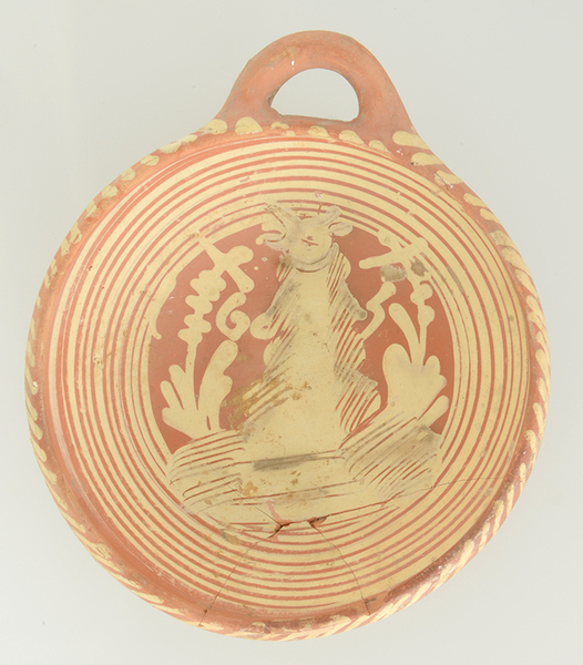 | 5c decoratie | slibversiering, in slibkrastechniek: berenjong, jaartal 1605 |