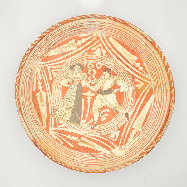 | 5c decoratie | slibversiering, in slibkrastechniek: danspaar met dubbele krans, jaartal 1605 |