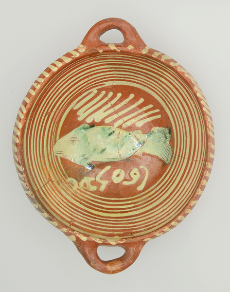 | 5c decoratie | slibversiering, in slibkrastechniek: vis, DCS en jaartal 1605 |