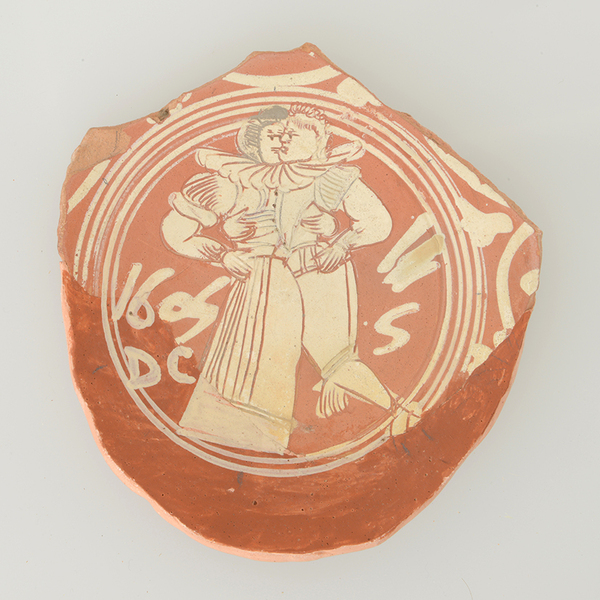 | 5c decoratie | slibversiering, in slibkrastechniek: liefdespaar, DCS en jaartal 1605 |