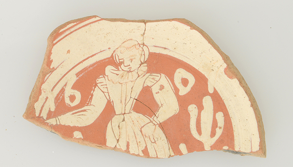 | 5c decoratie | slibversiering, in slibkrastechniek: vrouw met vleugelmuts, jaartal 1605 |