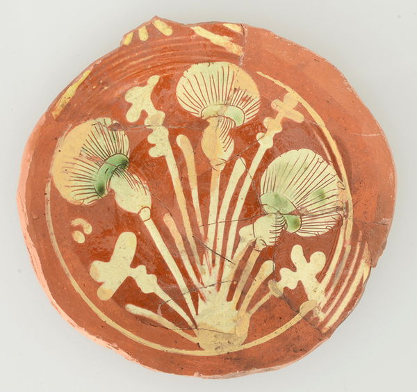 | 5c decoratie | slibversiering, in slibkrastechniek: 3 distelbloemen |