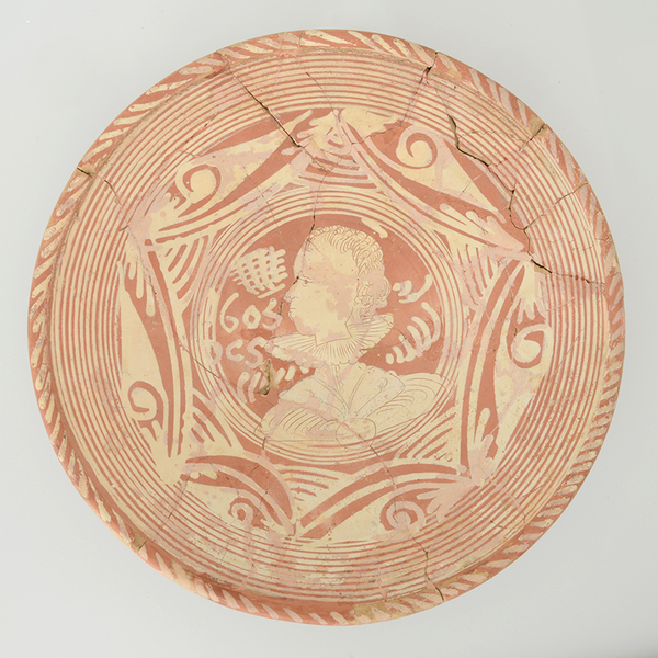 | 5c decoratie | slibversiering, in slibkrastechniek: mannenkop, DCS en jaartal 1605 |