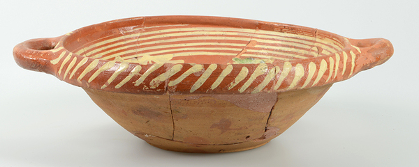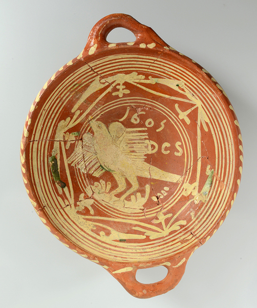 | 5c decoratie | slibversiering, in slibkrastechniek: vogel met gespreide vleugels, DCS en jaartal 1605 |