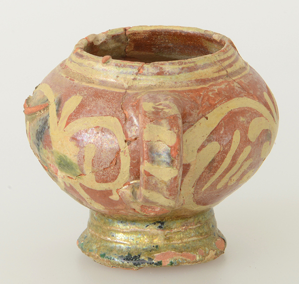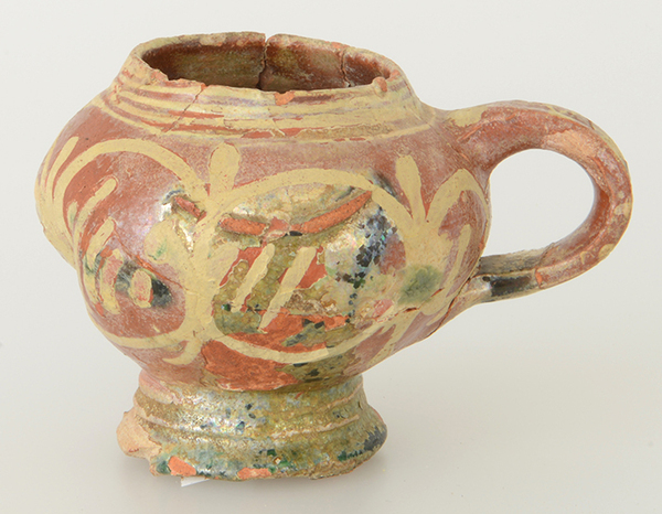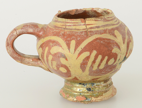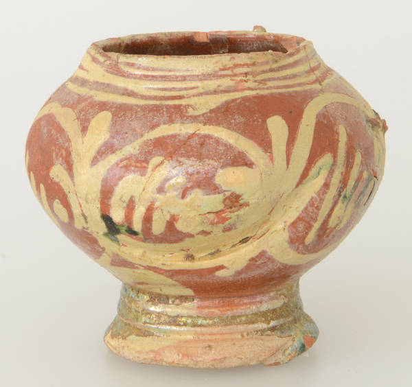 | 4b | bolle mosterdpot met vloeiende overgang naar korte, opstaande rand, met oor en standvoet |