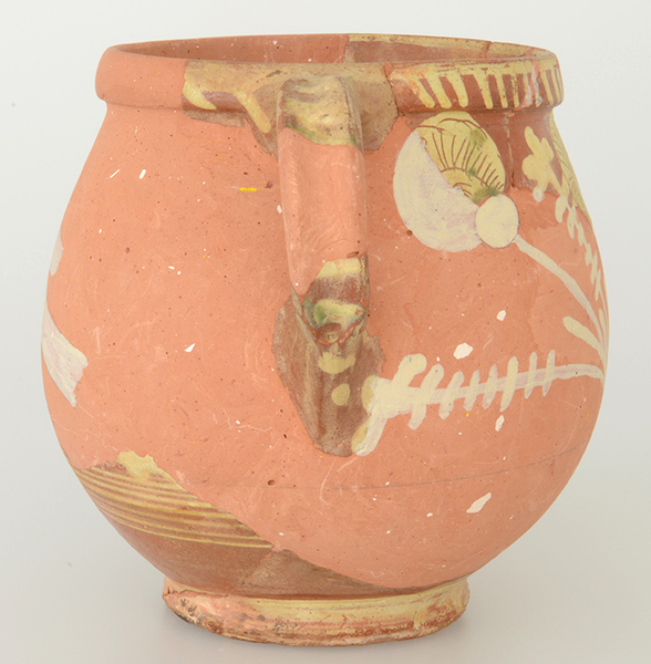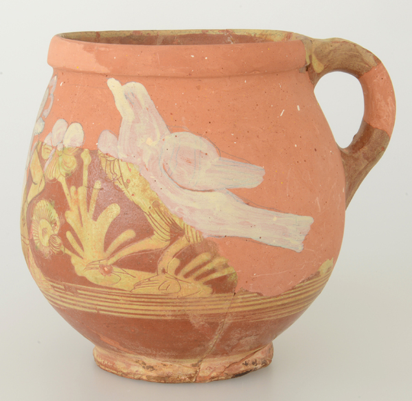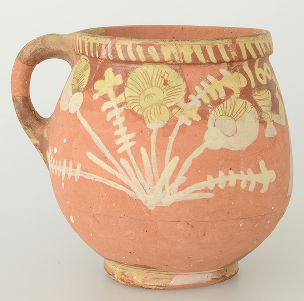 | 5c decoratie | slibversiering, in slibkrastechniek: vrouw met kelk, een vogel en distelbloemen, jaartal 1605 |
