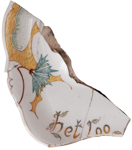 | 5c | P-decor (porselein decor) in de volksmond ook wel kantjesdecor genaamd, bestaande uit bloemen en insecten en opschrift Het Loo polychrome beschildering |