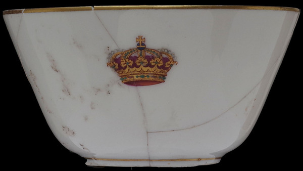 | 5c decoratie | gouden koningskroon in goud en rood recht tegenover oor, gouden bies langs rand, standring en oor polychroom (bovenglazuur) |