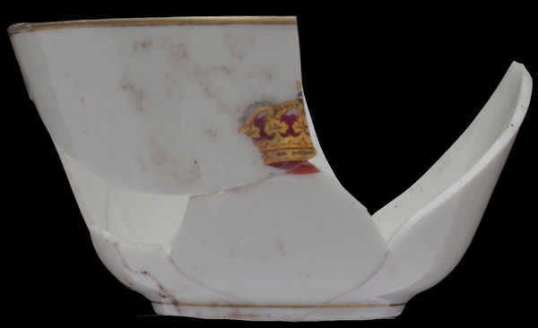 | 5c decoratie | gouden koningskroon in goud en rood recht tegenover oor, gouden bies langs rand, standring en oor polychroom (bovenglazuur) |