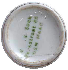 | 5d | dunwandig porselein, merk: Gebr. Soek / Parkstraat 65 / Den Haag (winkeliersmerk) |