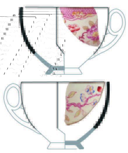 | 5c | transferprint: floraal motief (familie roze), ijzerbruine rand polychroom (bovenglazuur) |