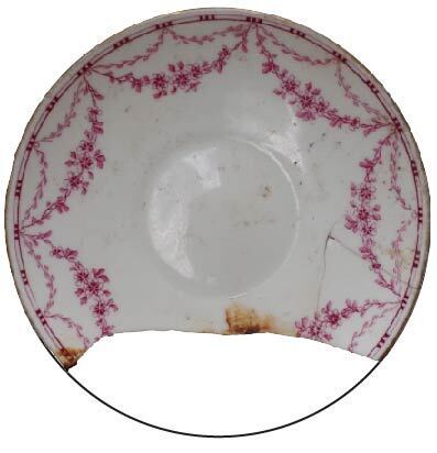 | 5c decoratie | dubbele rode guirlandes, gouden bies op rand polychroom (bovenglazuur) |