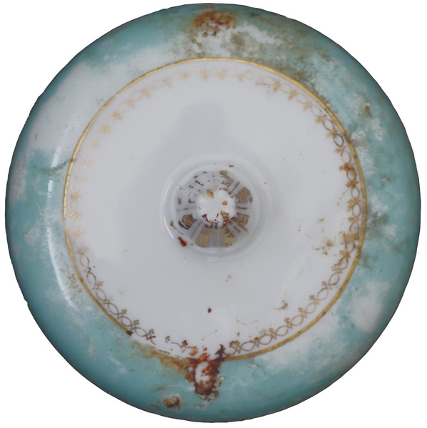 | 5c | rondom rand een gouden bies, met daarboven een brede mintgroene band en weerdaarbinnen dunne gouden bandje met aaneengeschakelde ovaaltjes, verguldsel op knop polychroom (bovenglazuur) |
