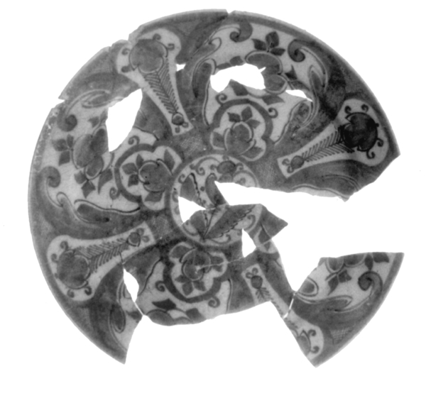 | 5c | vlag en spiegel: repeterend motief van rozenbottels en bloemen om centrale bloem in cirkel inwendig blauw |
