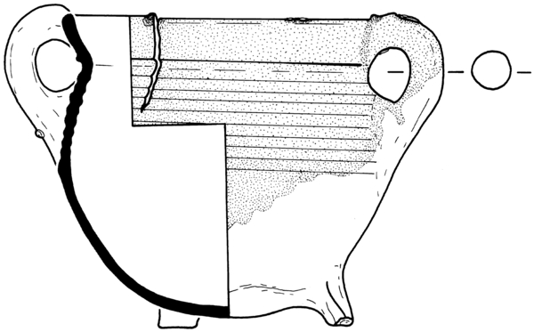 | 5d diversen | poten gesleten, niet beroet, misbaksel met bakscheur in rand, rode aanbaksels, aan binnenzijde bij oor rode aanbaksels, was voorheen r-gra-36 |