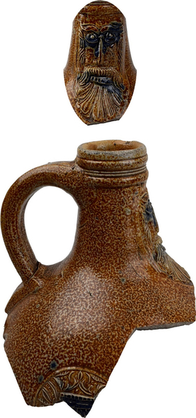 | 5c decoratie | uitwendig appliques: baardman op hals, bovenkant van wapenschild op wand, kobaltblauwe vlekken op appliques uitwendig blauw staart bij ooraanzet |